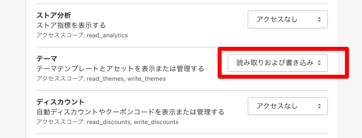 「Admin API」の「テーマ」項目を「読み取りおよび書き込み」に変更します。