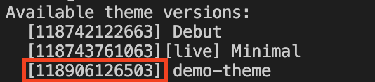 theme get --list -p=(発行されたパスワード) -s=(ストアのURL:sample.myshopify.com)テーマの一覧が表示されたら今回編集するテーマIDを控える