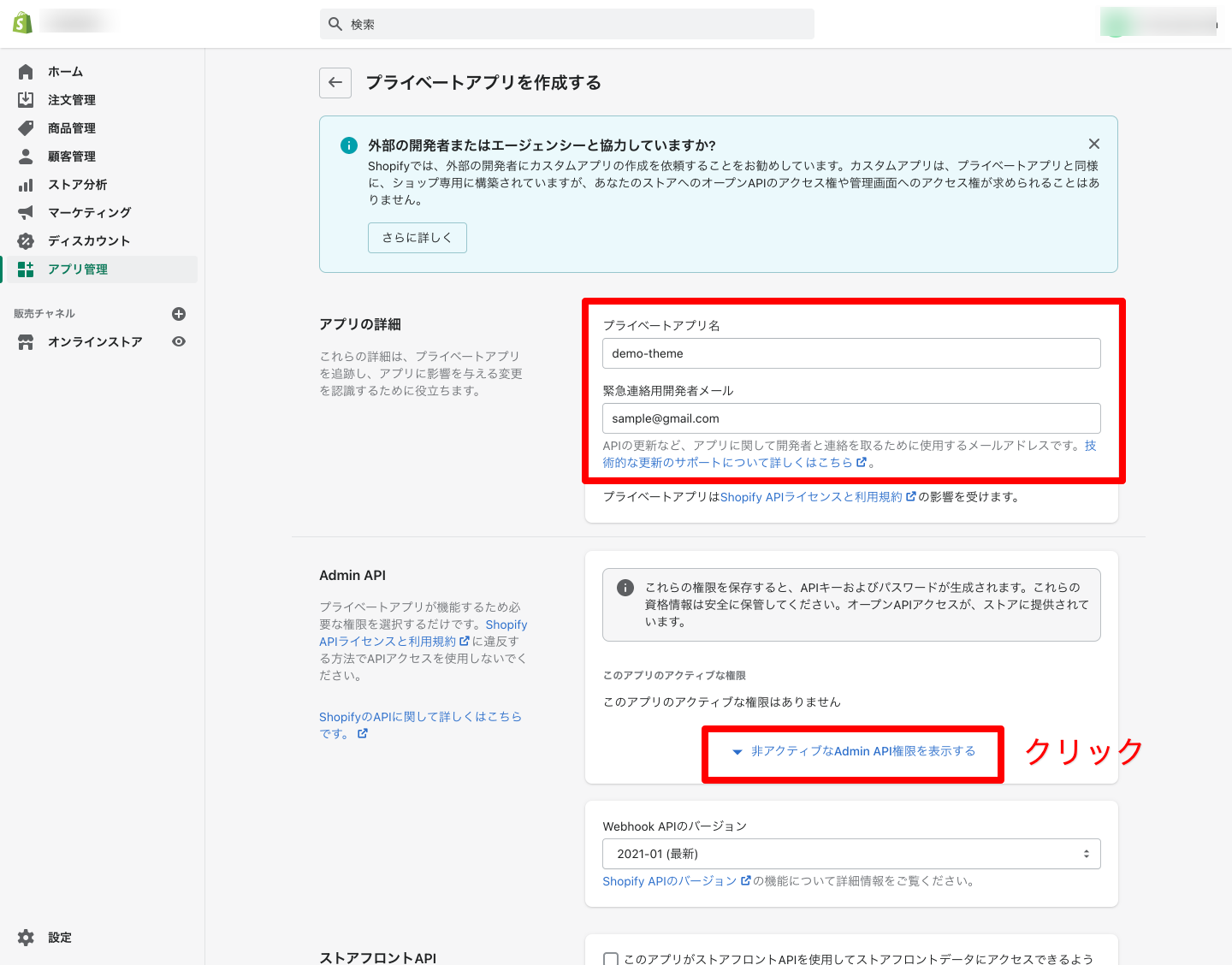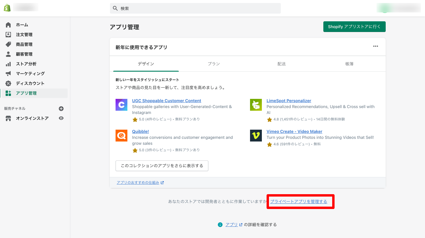 ショップの管理画面からプライベートアプリを作成します。