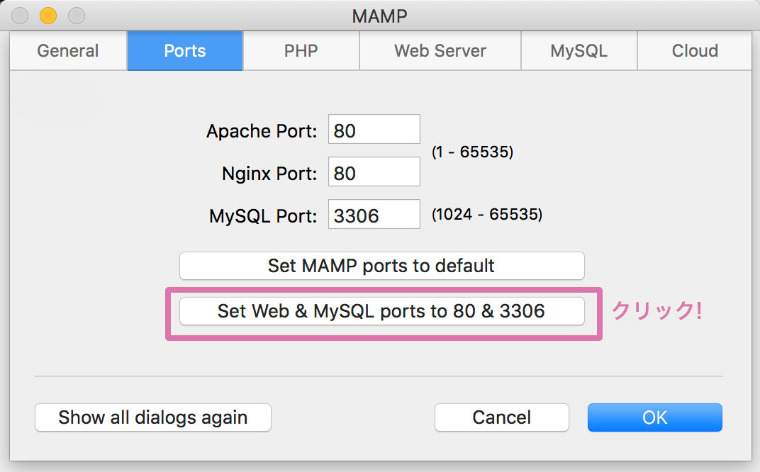 [Set Web & MySQL ports to 80 & 3306] をクリックしてポートを80番に変更します。