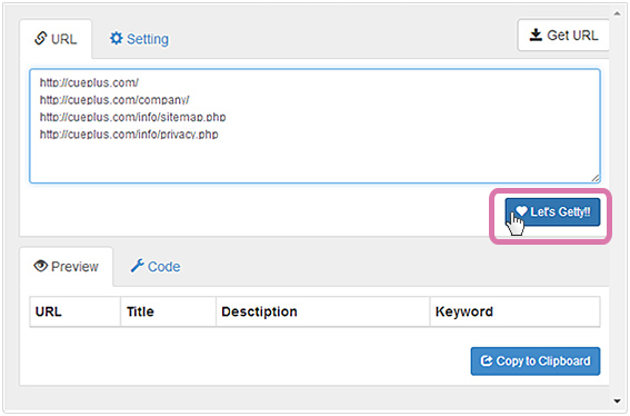 URLを打ち込むか、タブで開いた状態で[GetURL]をクリックしてページリストを作りたいサイトのURLを入力。[let’sgetty!]をクリックするとmeta情報が一覧で表示されます。